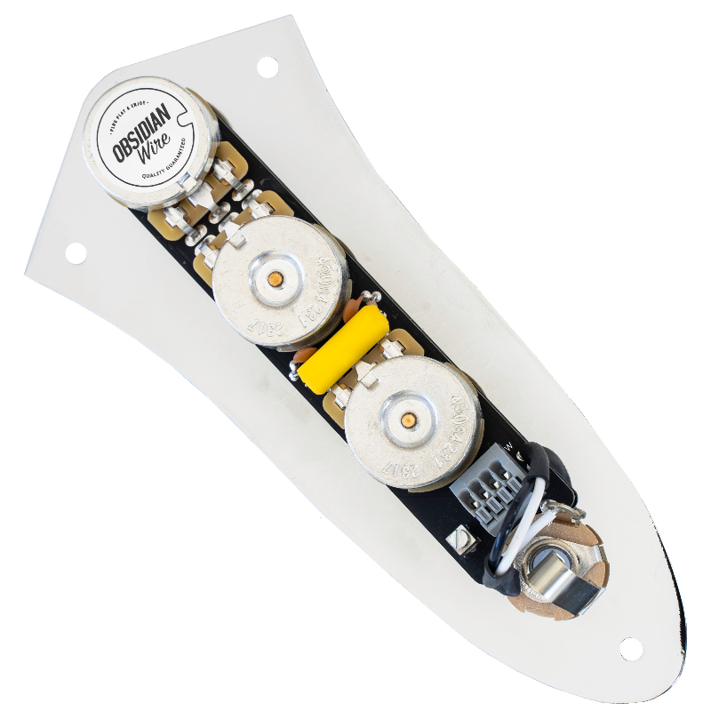 A loaded jazz bass control plate is placed bottom side up to display the three CTS potentiometers (pots) and jack